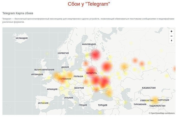Сбой зафиксирован у пользователей Telegram из Москвы, Санкт-Петербурга и некоторых других городов России, а также в Украине, в Беларуси, Германии, Нидерландах и других странах Европы, по данным ресурса DownDetector.