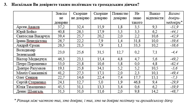 Баланс доверия и недоверия является отрицательным и превышает -40% и для оппозиционных политиков. Бывшему нардепу от «Голоса» Святославу Вакарчуку доверяют 22% (не доверяют 65,1%), лидеру «Батьківщини» Юлии Тимошенко – 16,7% (не доверяют 76,6%), лидеру «Европейской солидарности» Петру Порошенко – 16,4% (не доверяют 78,8%), нардепу от «Оппозиционной платформы – За жизнь» Виктору Медведчуку – 20,2% (не доверяют 79,4%), а сопредседателю ОПЗЖ Юрию Бойко – 23,2% (не доверяют 67,3%).