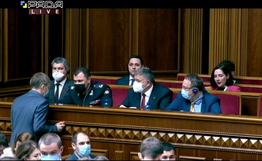 Во время обсуждения законопроекта в зале присутствовало руководство МВД и Нацполиции. Глава Нацполиции Игорь Клименко (второй слева), министр внутренних дел Арсен Аваков (в центре) и заместитель главы МВД Антон Геращенко (справа). Скриншот: RadaTVchannel / YouTube