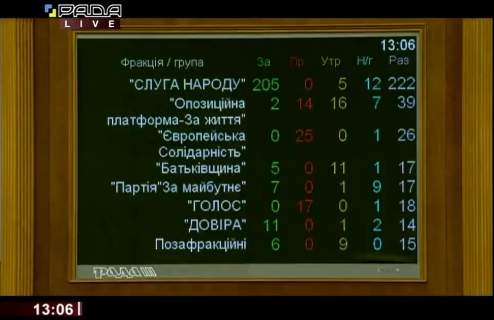 «За» проголосовали 236 депутатов при минимально необходимых 226. Законопроект поддержали 205 народных депутатов от «Слуги народа», 11 – из группы «Довіра», семь – из группы «Партия «За майбутнє», пять – от «Батьківщини», двое – от «Оппозиционной платформы – За жизнь», а также шесть внефракционных. «Европейская солидарность» и «Голос» не дали ни одного голоса.