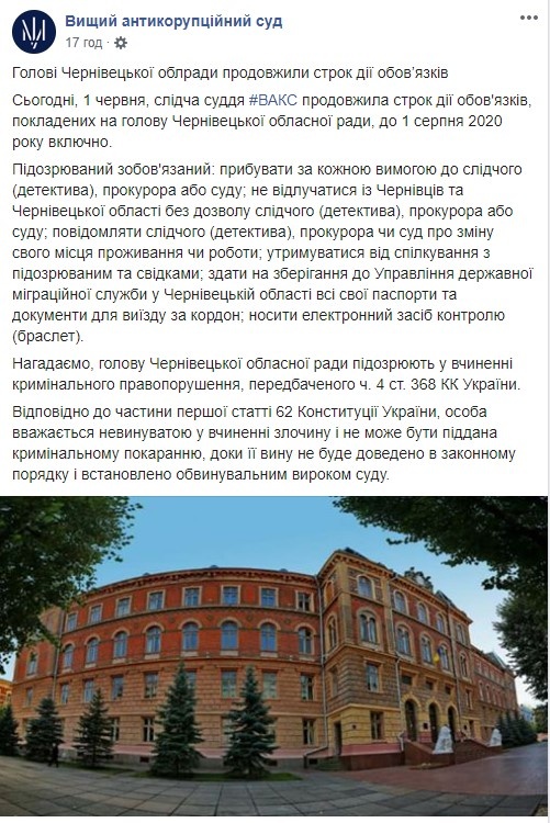 Высший антикоррупционный суд 1 июня продлил срок действия обязательств, возложенных на главу Черновицкого областного совета Ивана Мунтяна, до 1 августа, говорится на Facebook-станице суда.