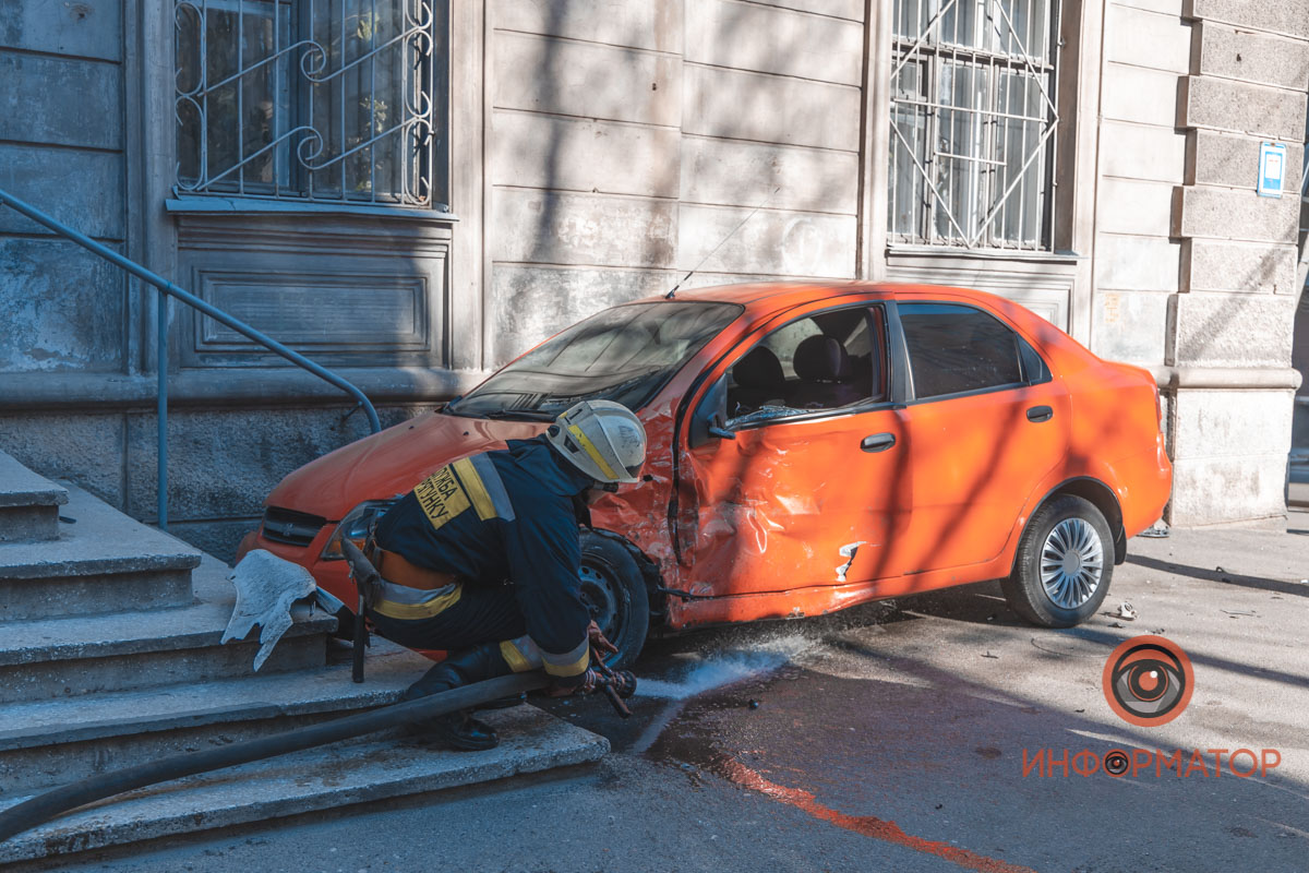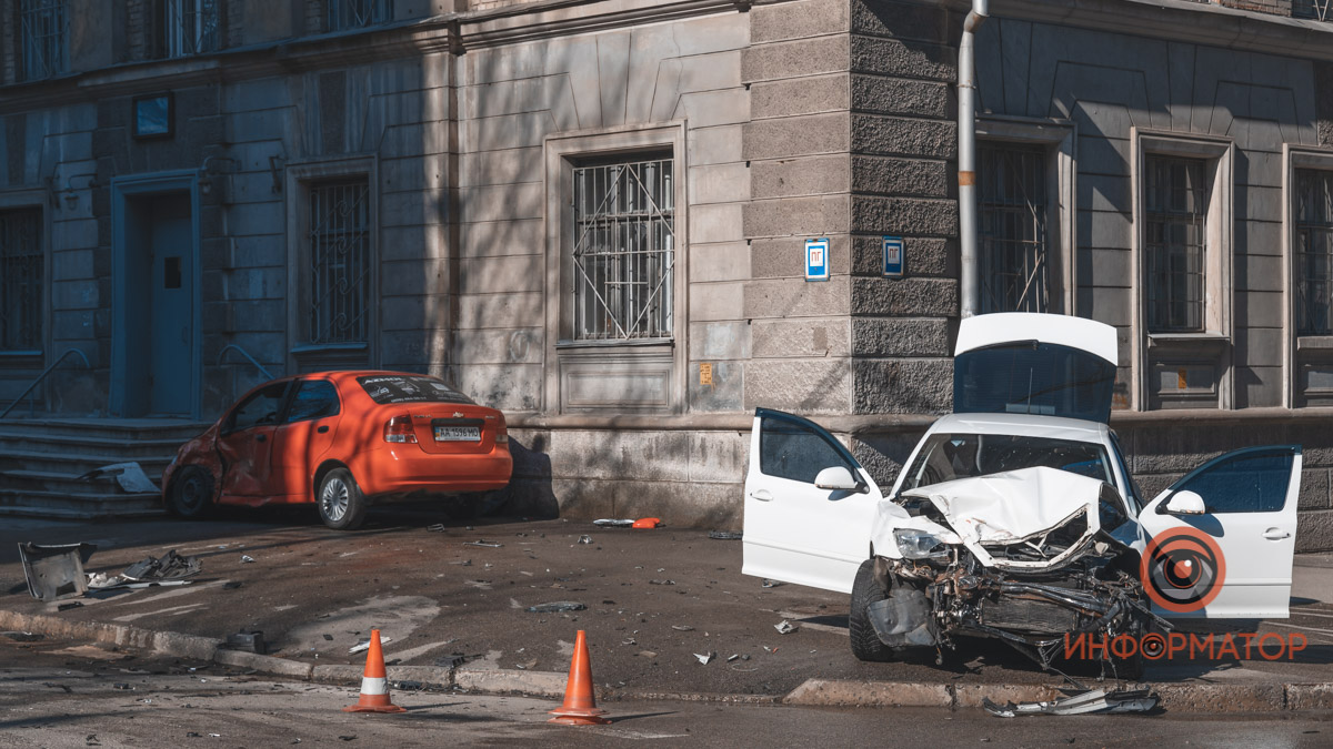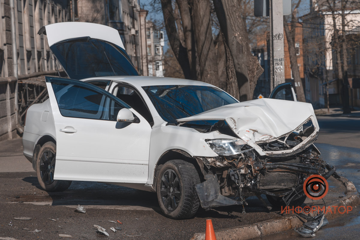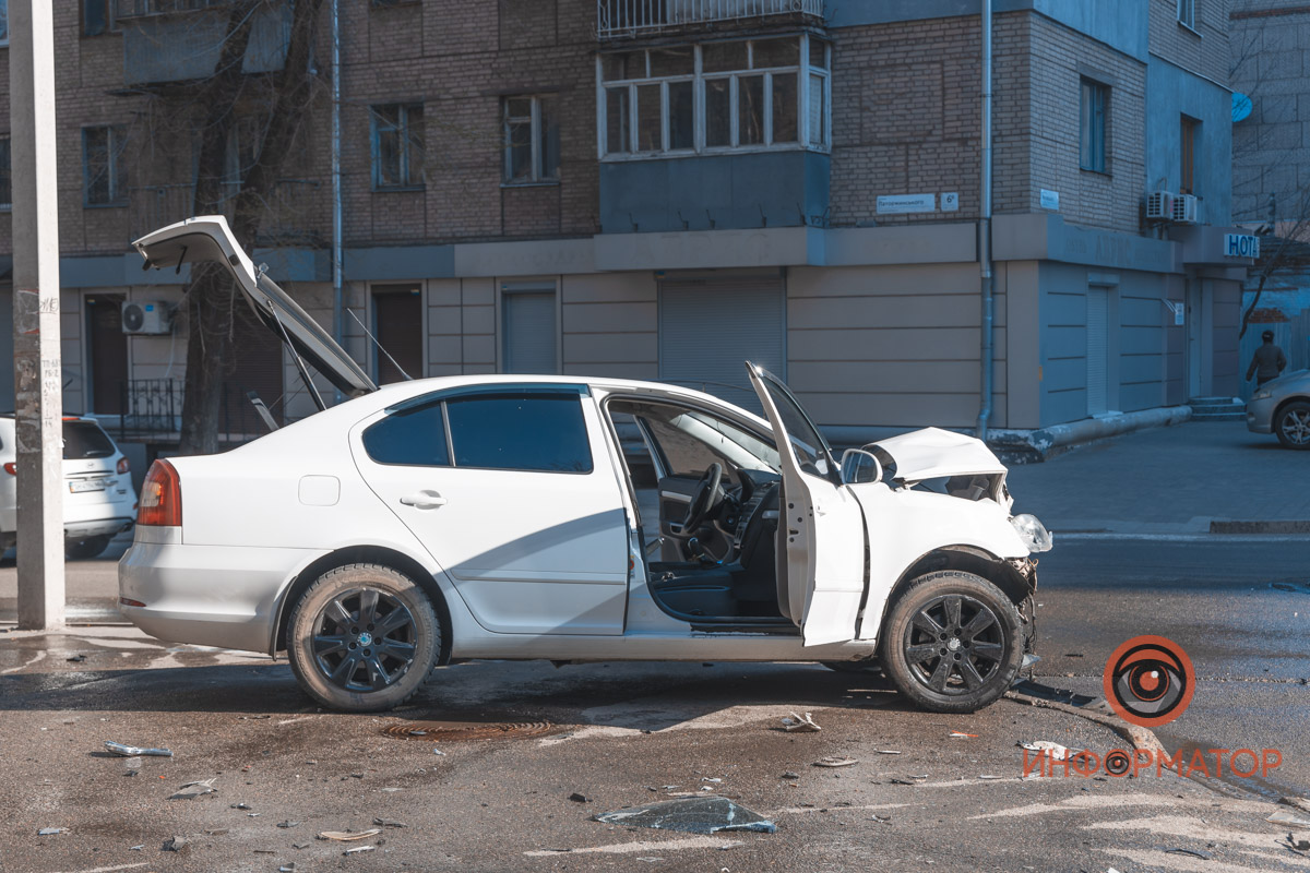По предварительной информации от полиции, Skoda ехала по главной — по улице Паторжинского — вниз. Водитель Chevrolet, двигаясь по Жуковского со стороны проспекта, проигнорировал знак «Уступи дорогу», вследстве чего «подставился» под автомобиль. От удара оба автомобиля вылетели на тротуар, а Chevrolet еще и врезался в ступеньки общежития.